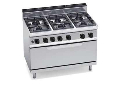 Bếp 6 bếp với lò nướng gas lớn G7F6+T / G7F6P+T là thiết bị bếp công nghiệp cao cấp, tích hợp 6 họng bếp công suất mạnh và lò nướng gas dung tích lớn. Với tổng công suất 43,5 kW cùng lò nướng 12 kW, sản phẩm đáp ứng hoàn hảo nhu cầu chế biến khối lượng lớn trong các nhà hàng, khách sạn và bếp ăn công nghiệp.