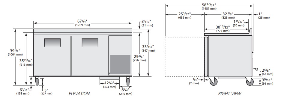 Khóa bánh xe có đường kính 5" (127 mm) được cung cấp ở bộ phía trước. Chiều cao bề mặt làm việc 36" (915 mm).