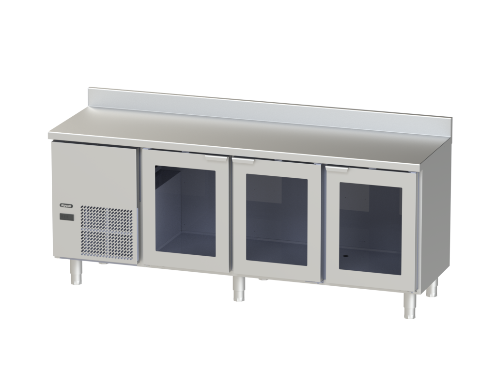 • • Máy làm lạnh âm bàn có độ sâu 600 mm với ốp lưng và 3 cửa kính.