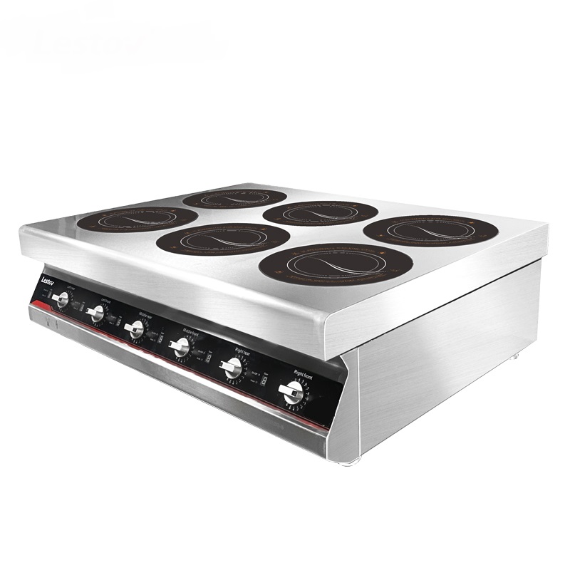 Bếp từ thương mại 6 đầu đốt để bàn này giúp các nhà hàng nhỏ gọn nấu thức ăn 6 * 3,5kg trong 15 phút, có thể đáp ứng khối lượng bữa ăn cho 90 người. Nó sử dụng công nghệ sưởi ấm cảm ứng, giúp tiết kiệm 35% tiền điện so với sưởi ấm bằng gas.