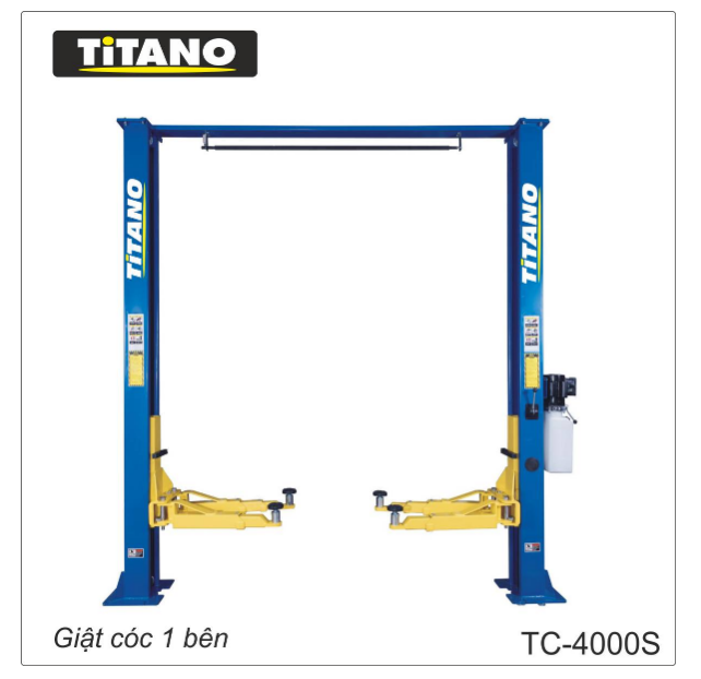 Cầu nâng ô tô 2 trụ đế dưới giằng trên, hạ cầu bằng cóc 1 bên