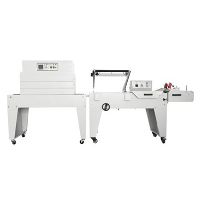 Tổ hợp máy gồm máy cắt màng bán tự động kiểu L chân cao DFQA-450 và máy co màng nhiệt BS-A450, giúp tạo thành quy trình đóng gói hoàn chỉnh từ cắt – hàn màng đến co màng nhiệt.