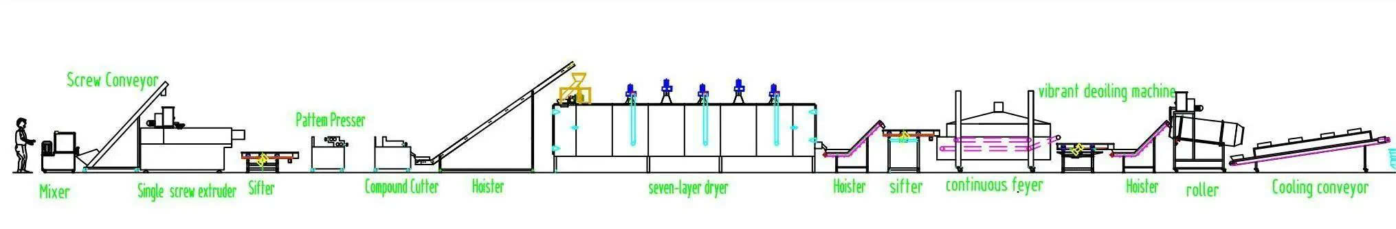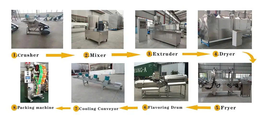 Thông qua công nghệ ép đùn tiên tiến, nguyên liệu được kéo giãn – tạo hình – sấy – chiên – tẩm gia vị – làm nguội để trở thành các sản phẩm snack có hình dạng độc đáo và độ giòn hoàn hảo.