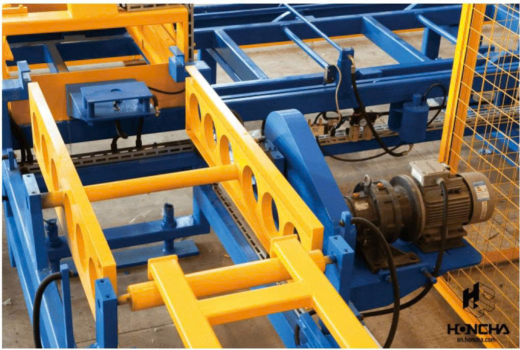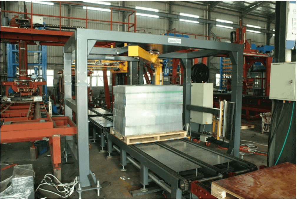 - Hệ thống thu thập khối gạch từ hai pallet cùng lúc và xếp chồng chéo lên băng tải ra ngoài.