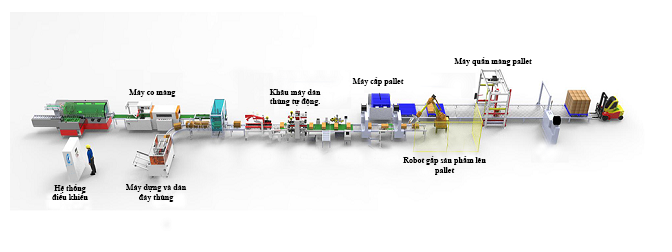 Hệ thống đóng gói hàng hóa tự động là giải pháp tích hợp toàn bộ quy trình đóng gói từ co màng sản phẩm, gắp sản phẩm vào thùng carton, dán thùng (2 mặt hoặc 4 góc cạnh) cho đến xếp thùng lên pallet bằng robot.