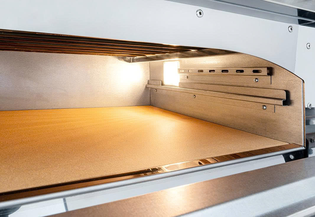 Nhỏ gọn là thế, nhưng hiệu suất thì không hề nhỏ: bạn có thể nướng 2 chiếc pizza cùng lúc (ø 45 cm), hoặc 2 khay kích thước Gastronorm GN 40x60 cm – đủ cho một lượng bánh phục vụ liên tục trong giờ cao điểm.