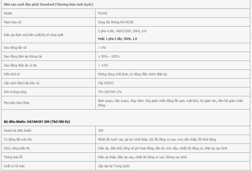 ModelTHG 20MMDĐộng cơMitsubishi - S4Q2Xuất xứ động cơNhật BảnĐiện áp (V)220Vòng tua (vòng / phút)1500Đầu phátMecc-Alte / LeroySommerBảng điều khiểnDatakom / DeepSeaCông suất liên tục (kVA)16.0Công suất dự phòng (kVA)17.6Tiêu hao nhiên liệu 75% tải (L ...