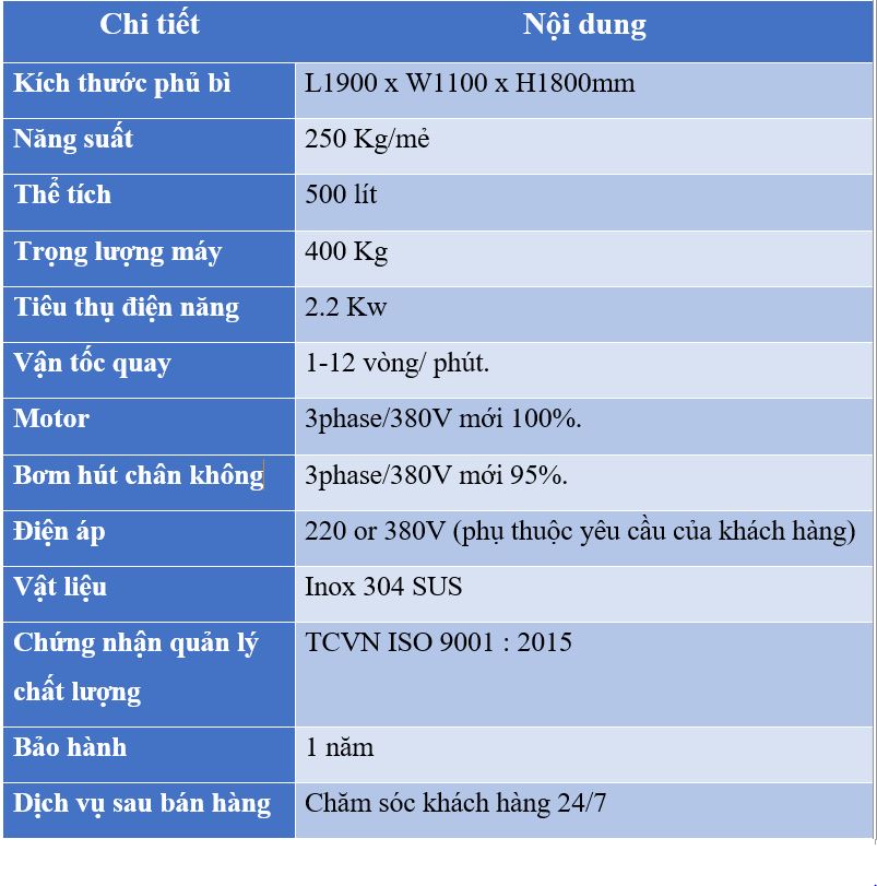 Năng suất : 400 kg/mẽKích thước: ø1500 x L1500.Thân bồn dày 2.5mm.Khung sườn: vuông 70 dày 3mm.3 cánh đơn dày 1.5mm.Motor giảm tốc: 2.2Kw/ 380V/ 50Hz.Vật liệu: Inox SUS 304. ...