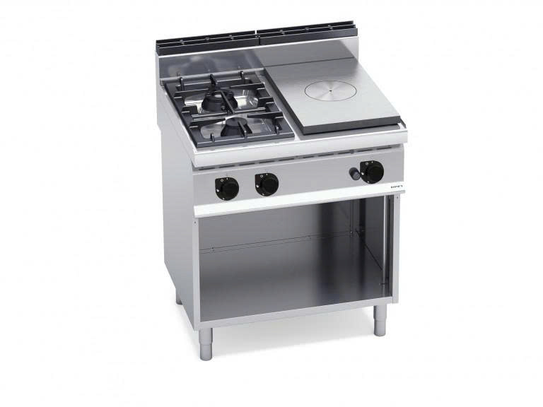 Bếp gas mặt liền khối + 2 bếp mở kèm tủ G7T4P2FM là thiết bị bếp công nghiệp tích hợp thông minh giữa mặt bếp phẳng (solid top), 2 họng bếp mở và khoang tủ chứa tiện lợi. Với tổng công suất 17,5 kW, sản phẩm đáp ứng linh hoạt nhu cầu nấu nhanh, nấu chậm và tối ưu không gian bếp chuyên nghiệp.
