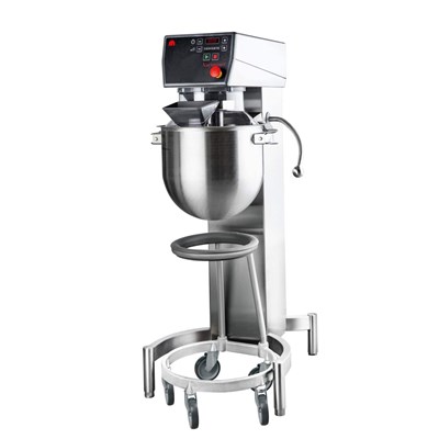 • Không phải nâng nặng nữa. Bát ổn định và được đặt trên một xe đẩy bát cao, có bánh xe bên dưới máy trộn để thực hiện các hoạt động đánh và nhào. Bát được khóa cố định, nâng lên và hạ xuống trong một chuyển động duy nhất bằng cách sử dụng tay cầm được thiết kế tiện lợi ở mặt bên của máy