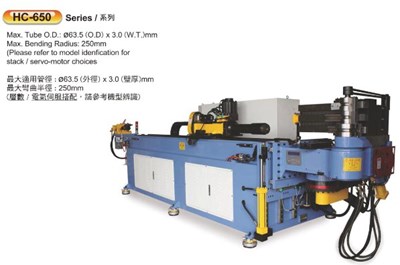 ModelNC-65HORSE POWER15 HPMAX. BENDING CAPACITY65x2.2 mmMAX. BENDING RADIUS (CLR)450 mmMAX. BENDING ANGLE1900LENGTH OF MANDREL2700 mmBENDING SPEED48 degree/secBENDING ACCURACY±0.1 degreeNUMBER OF PROGRAM99BENDING NUMBER20DIMENSION (CM ...