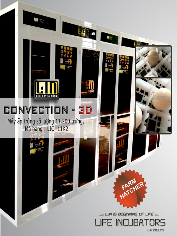 Hàn quốc, Hệ thống CONVECTION (đối lưu) , máy có thể ấp đa kỳ, hoặc đơn kỳ mỗi ngày vào trứng 1 lần, lọc không khí sạch bằng tia cực tím, CONVECTIONtiết kiệm điện . |