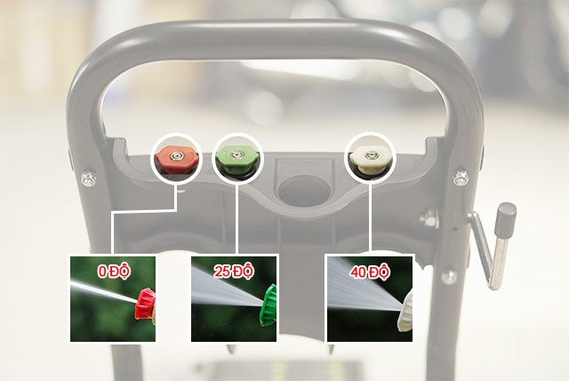 - 💧 Đầu phun 25° và 40° giúp xịt rửa toàn thân xe nhẹ nhàng, không gây trầy xước lớp sơn.