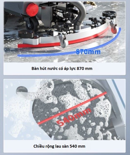 - 🧹 Chiều rộng bàn hút nước 870mm & bàn chải 540mm: Làm sạch nhanh, hiệu quả diện tích lớn.
