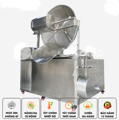 - Bồn chiên có thể tích lớn, lên đến 100L, cho phép chiên (luộc, chần) được một khối lượng lớn nguyên liệu thực phẩm trong thời gian ngắn. Làm giảm khả năng bị oxy hóa, giữ được chất lượng dầu chiên tốt hơn so với nhiều loại máy chiên khác. Ngoài ra, bộ phận cảm biến nhiệt bên dưới bồn sẽ nhận giá trị nhiệt độ chính xác nhất để hiển thị ở phần bảng điều khiển để có thể dễ dàng kiểm soát được nhiệt độ khi sử dụng.