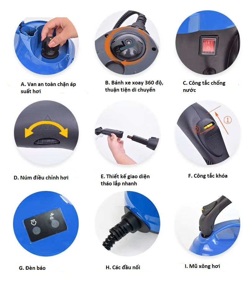 - ✅ Hơi nước mạnh, nhiệt độ cao, khử trùng hiệu quả