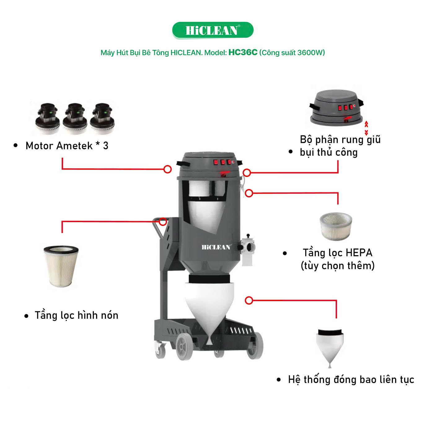 Máy hút bụi bê tông HiClean HC36C (3.600W) chính là giải pháp toàn diện, giúp bạn: