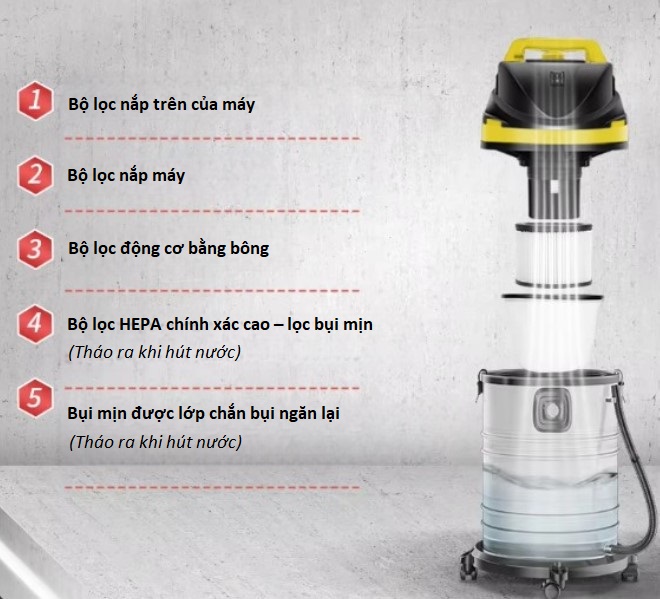 ✔ Lớp chắn bụi mịn (bụi được loại bỏ khi hút nước)