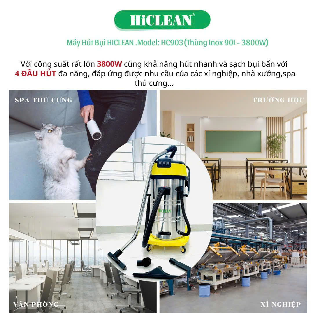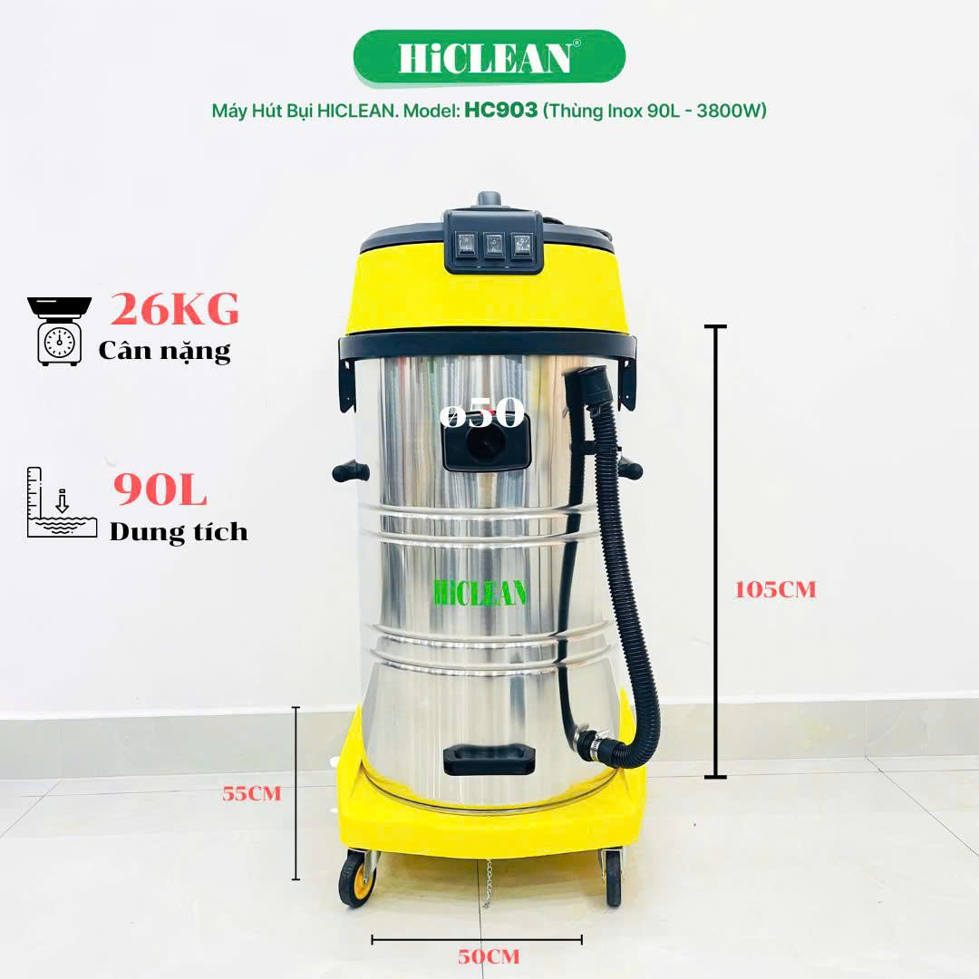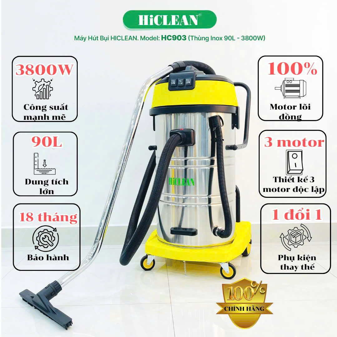 Với thiết kế hiện đại, motor Italy bền bỉ, công suất 3800W, dung tích 90L và khả năng hút khô/ướt, HiClean HC 903 là máy hút bụi công nghiệp đáng tin cậy, giúp các nhà máy, xưởng sản xuất và kho bãi vệ sinh nhanh chóng, hiệu quả và an toàn.