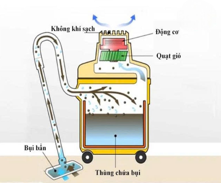 - ⚡ Motor công suất 1300W kết nối với cánh quạt trong thân máy. Khi cấp điện, cánh quạt quay tạo ra lực hút mạnh, hút bụi, chất lỏng và rác thải từ bề mặt qua ống hút.