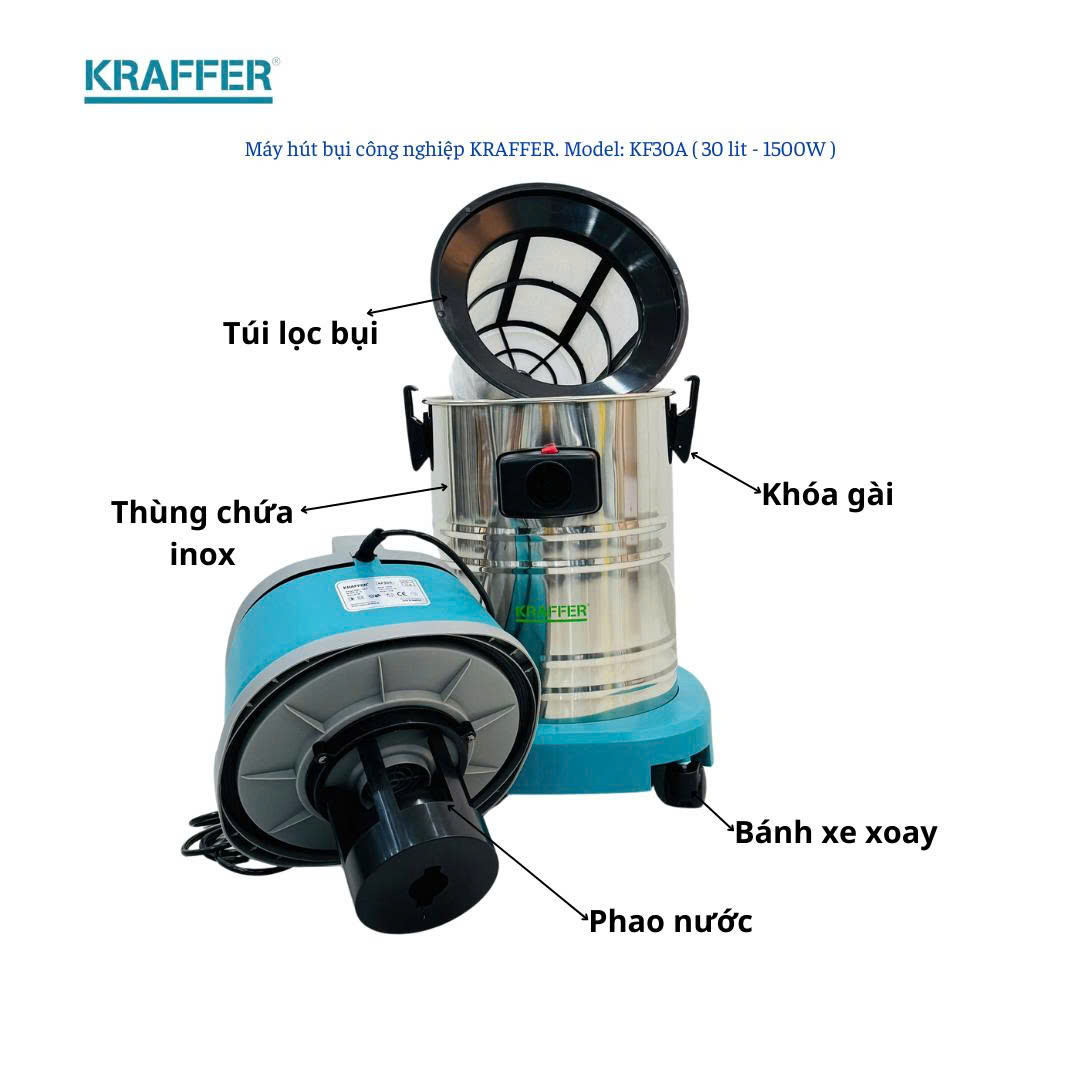 Máy hút bụi công nghiệp Kraffer KF30A là thiết bị khô – ướt đa năng, sản xuất với công nghệ Italy chuẩn Châu Âu. Đây là sự kết hợp hoàn hảo giữa: