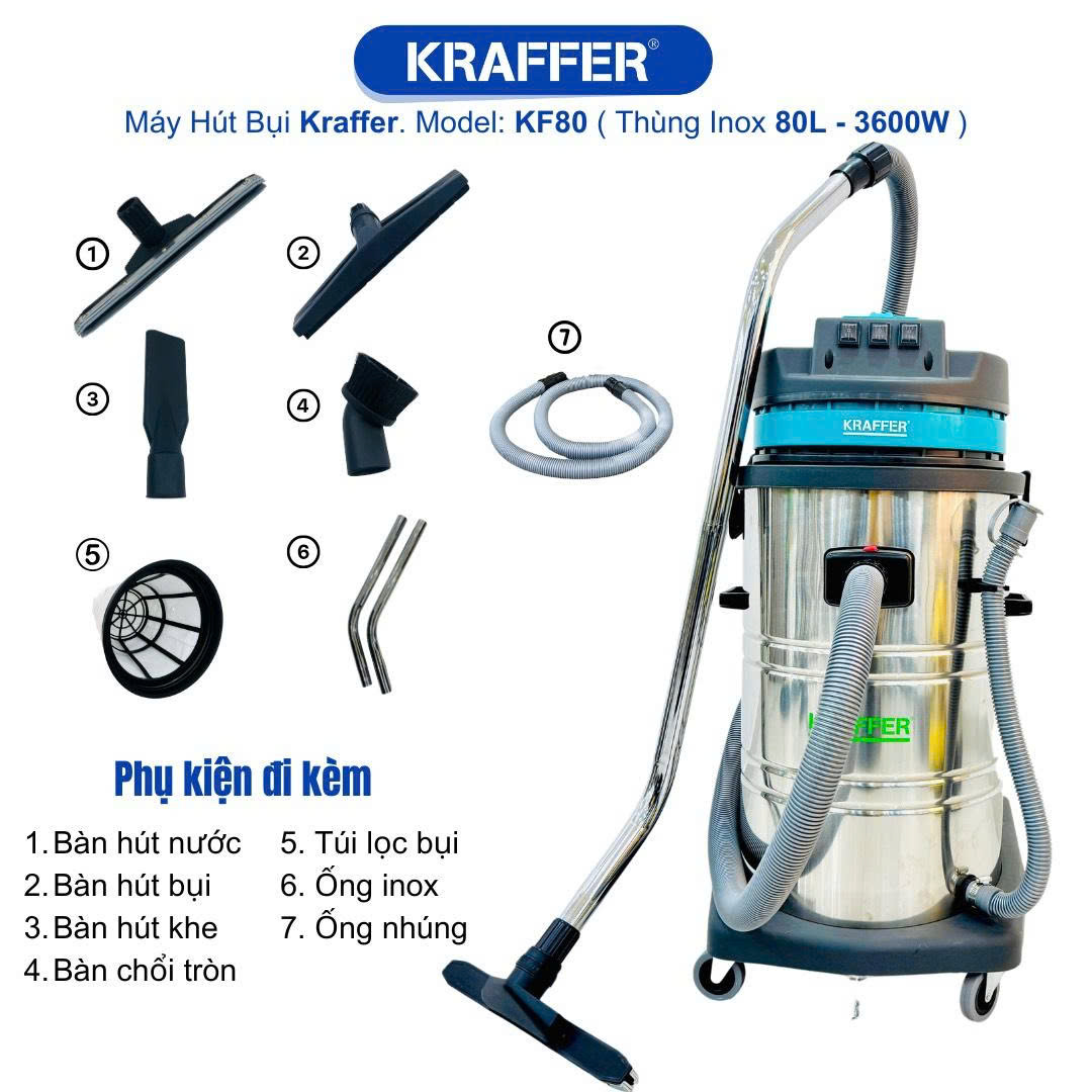 Máy hút bụi công nghiệp Kraffer KF80 không chỉ là một thiết bị hút bụi, mà là giải pháp toàn diện cho mọi môi trường công nghiệp, văn phòng và kho bãi. Từ thiết kế thông minh, công suất mạnh mẽ, mô tơ bền bỉ, đến thùng chứa lớn và phụ kiện đa năng, KF80 giúp bạn tiết kiệm thời gian, công sức và chi phí, đồng thời nâng cao chất lượng vệ sinh và an toàn sức khỏe.