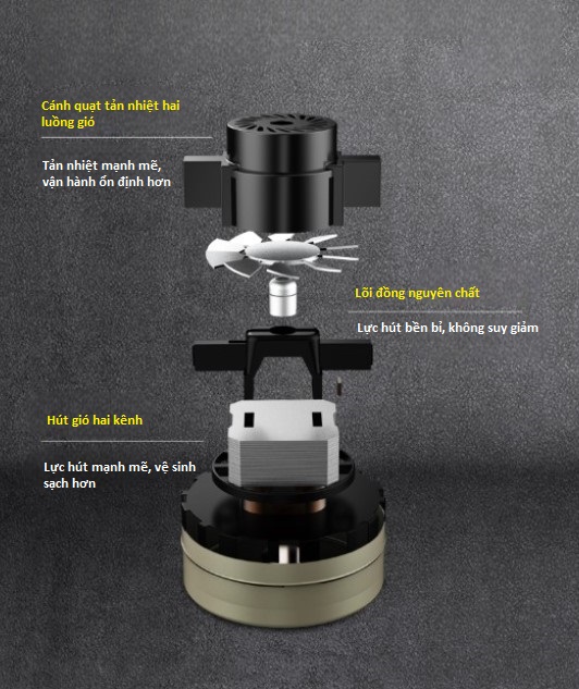 - Động cơ dây đồng nguyên chất kép, không chổi than