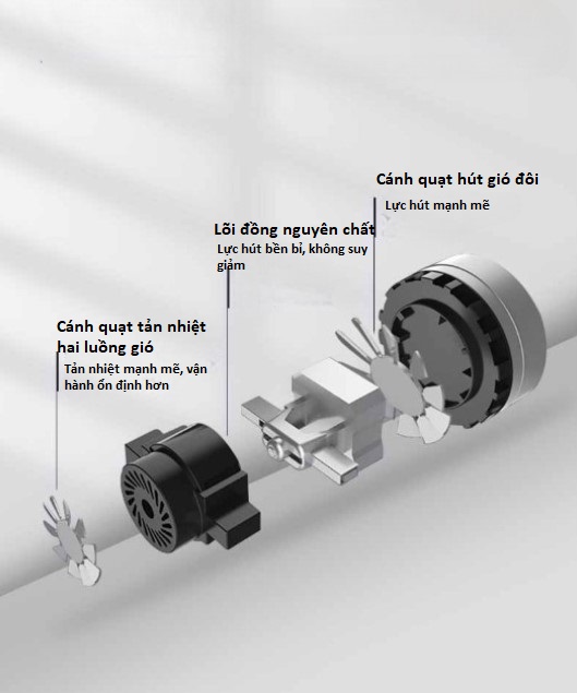 - Động cơ lõi đồng nguyên chất, lực hút ổn định theo thời gian