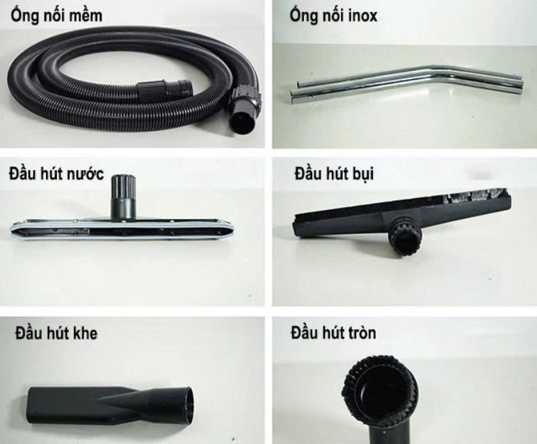 Ống dẫn hướng inox, ống dẫn mềm, bàn hút bụi, bàn hút nước, chổi tròn, đầu hút khe