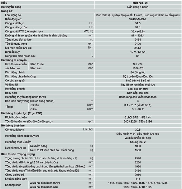 📊 THÔNG SỐ KỸ THUẬT KUBOTA MU5702