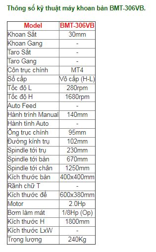 Khả năng khoan max (mm)25/31.5Đường kính trụ máy (mm)85Hành trình trục chính max (mm)110Khoảng cách giữa trục chính và trụ máy (mm)200Khoảng cách từ mũi trục chính đến bàn (mm)480Khoảng cách từ mũi trục chính đến bệ(mm)670Độ côn trục chínhMT3Dải tốc ...