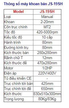 Khả năng khoan lớn nhất: Ø25 mm – Khả năng taro lớn nhất: M20 – Đường kính trụ: 85mm – Hành trình trục chính: 125mm – Khoảng cách từ trục chính đến bàn: 367mm – Khoảng cách từ trục chính đến chân đế: 630mm – Kiểu côn trục chính: MT3 – Tốc độ (5 cấp): ...