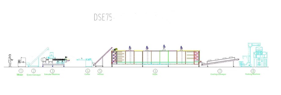 Máy trộn → Băng tải trục vít → Máy đùn → Máy cắt → Máy nâng → Máy sấy → Băng tải làm mát → Máy đóng gói