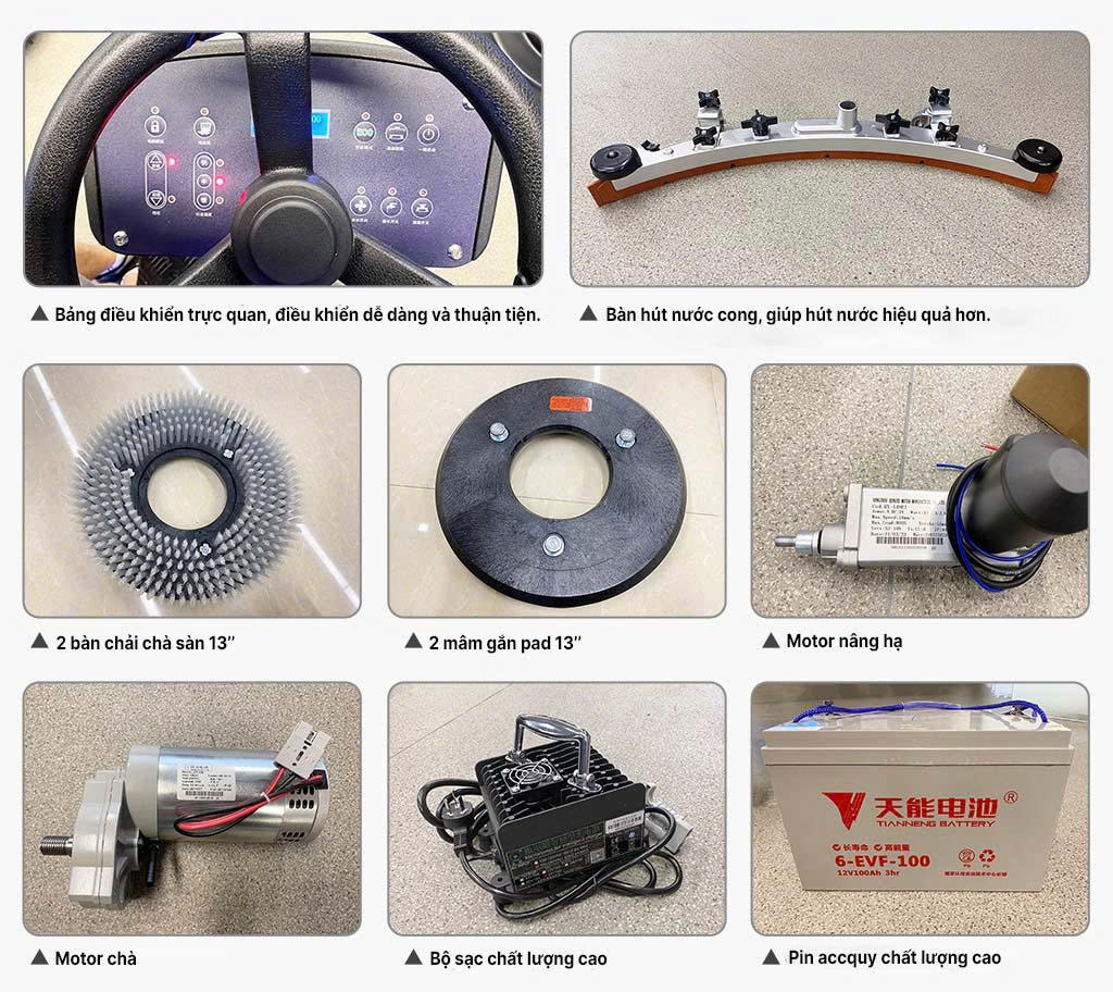 2 bàn chải chà sàn, 2 bình ắc quy, 1 bộ sạc
