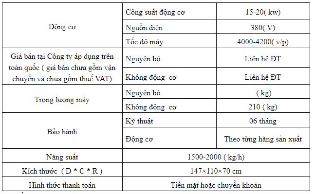 - Công suất động cơ 15-20 kw, dùng dòng điện 380V cho năng suất cao đạt 1500-2000 kg/h.