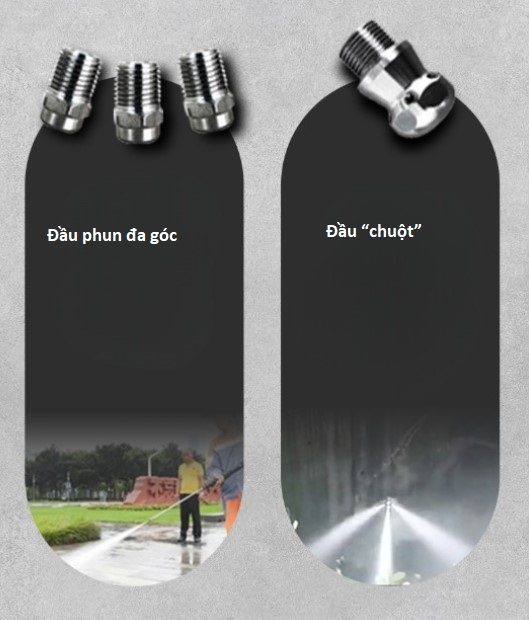 - 🔹 Đầu “chuột”: Thông cống, phối hợp với các loại đầu “chuột” khác nhau để thông tắc hiệu quả
