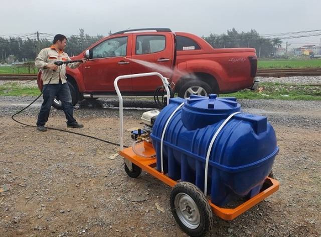🔧 Chuẩn bị: Đổ nước vào bồn 300L, kiểm tra nhiên liệu động cơ và kết nối dây áp lực với súng phun.