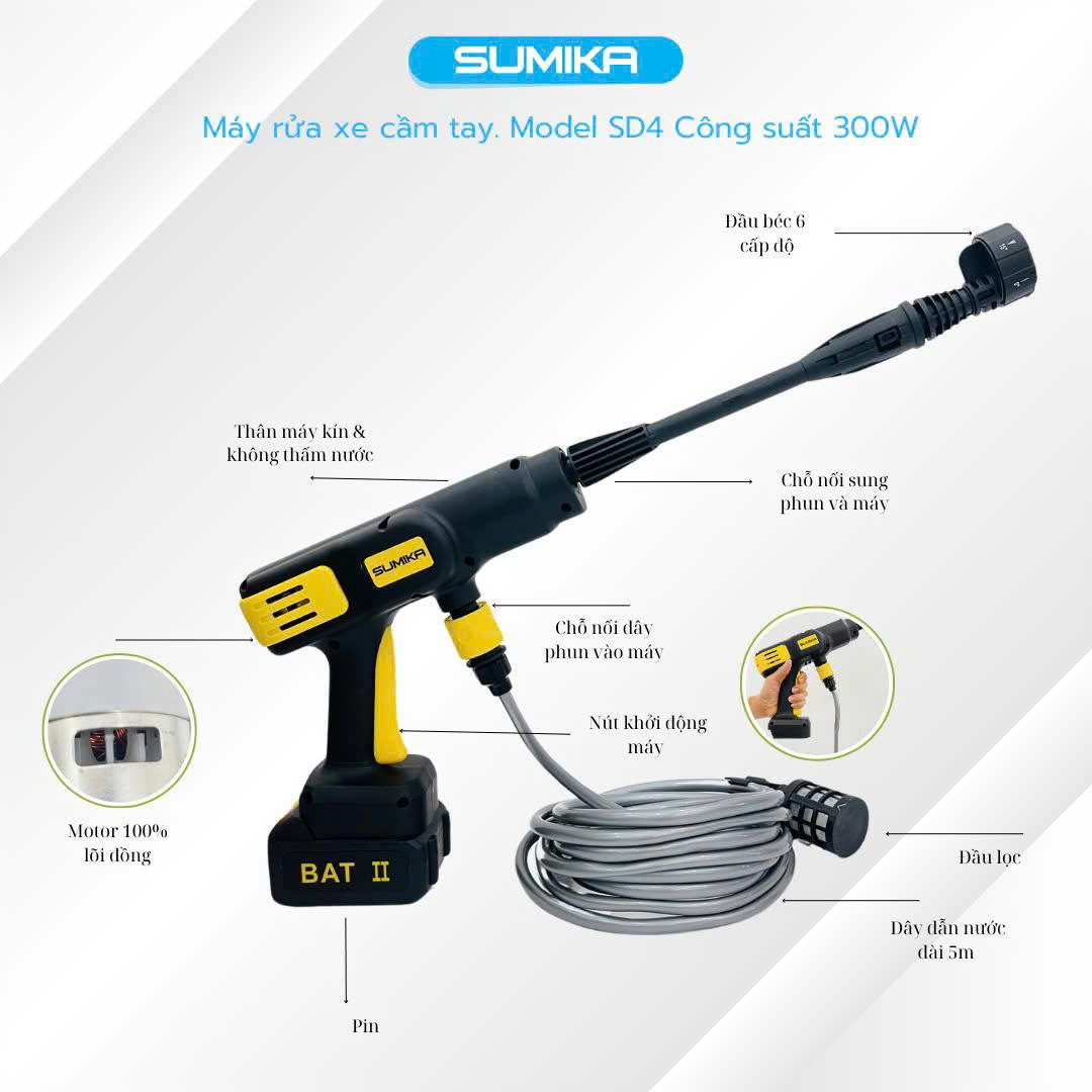 Máy rửa xe cầm tay dùng pin Sumika SD4 300W là thiết bị vệ sinh đa năng, nhỏ gọn và mạnh mẽ:
