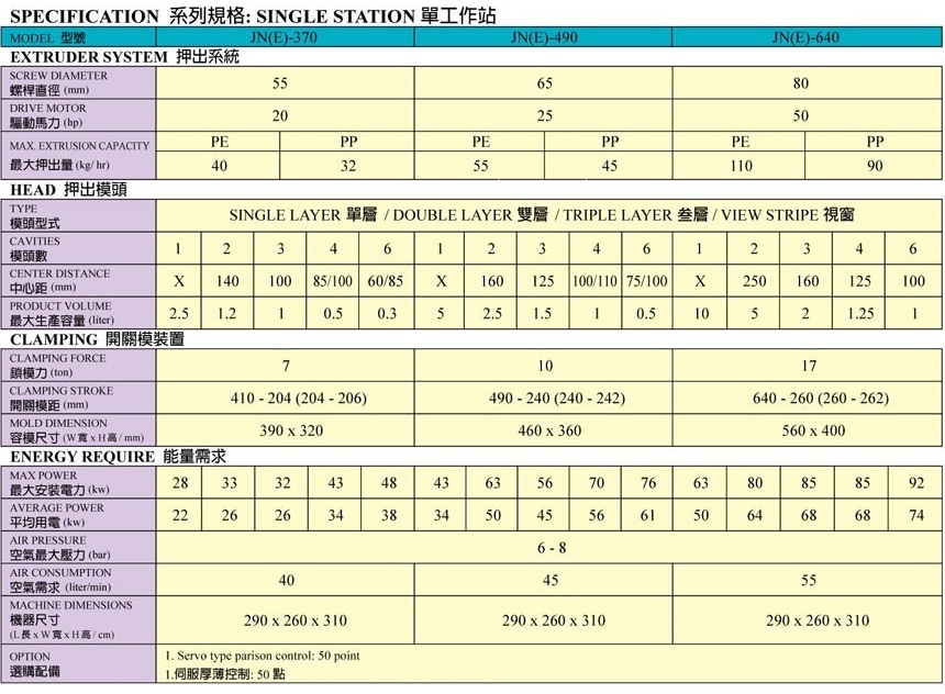 Danh mụcThông số kỹ thuậtTiêu chuẩn kích cỡGiải thíchDung tích (L) 2L(MAX) Thiêt bị đùn ( đùn chính)Đường kính trục vítΦ60mm Tỉ lệ trục vít24:1 Chất liệu trục vít 38CrMoALACông suất đùn45KG/HrFor HDPE5502 exampleMô thức đùnHộp số khống chế+ băng tải ...