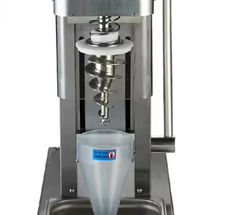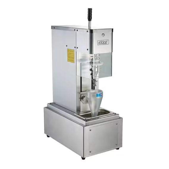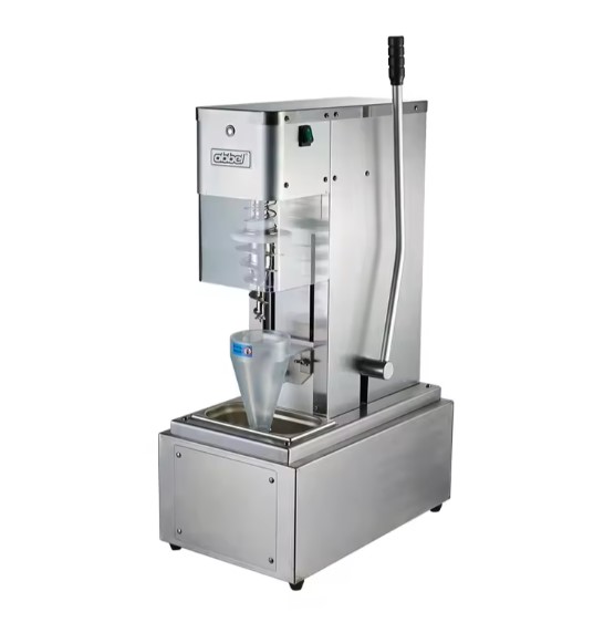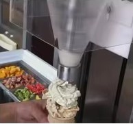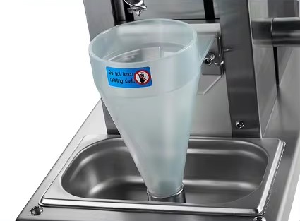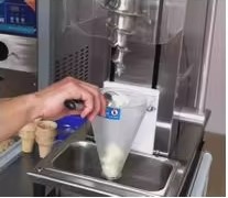 Bước 3: Trong khi một tay kéo cần gạt, tay kia giữ kem ốc quế, cốc hoặc đĩa đựng kem ở dưới tô trộn. Trong vòng 6 giây, nguyên liệu ban đầu đã được trộn sẽ được phân phối và thả cần gạt về vị trí cũ.