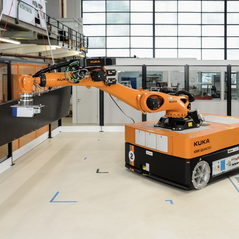 🤖 Robot kết hợp giữa cánh tay robot công nghiệp KUKA và nền tảng AGV omniMove UTV-2, tạo thành hệ thống robot di động linh hoạt.