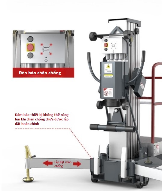 - Khi chưa đủ 4 chân chống cố định đúng vị trí → ❌ máy KHÔNG hoạt động