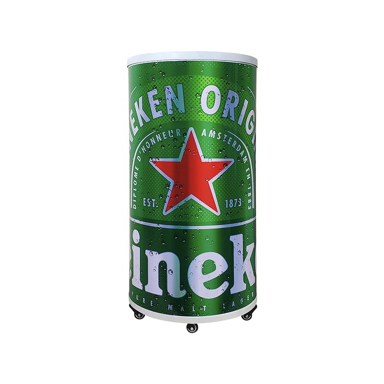 Tủ được tạo hình như một chiếc thùng năng động, tượng trưng cho sự tươi mát và năng lượng – cực kỳ phù hợp để đặt ở quầy bar, siêu thị mini, sự kiện ngoài trời hoặc gian hàng quảng bá thương hiệu.
