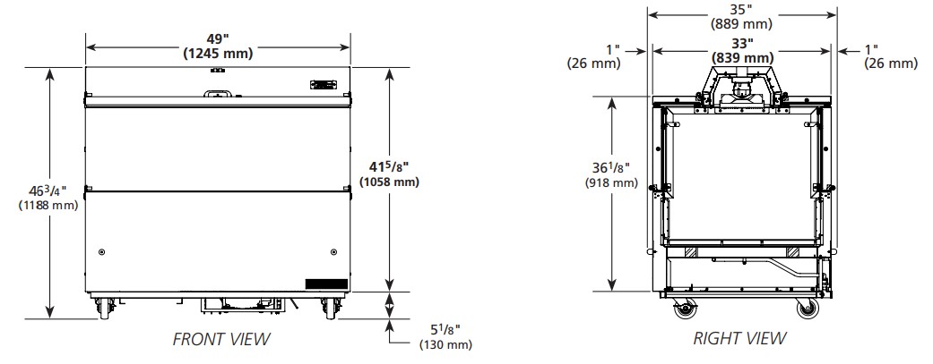 Đường ray khung được trang bị bốn (4) bánh xe xoay dễ lăn, đường kính 4" (102 mm) (bánh xe phía trước khóa cố định).
