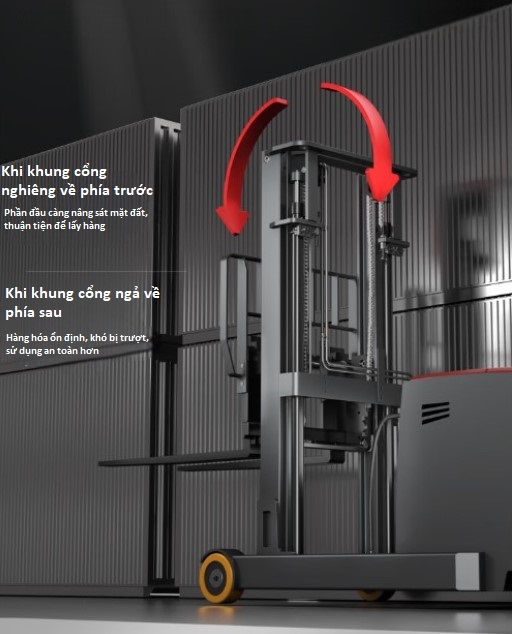 - 🔹 Tùy chọn nghiêng về phía trước hoặc ngả về phía sau, góc nghiêng tối đa 5°, phù hợp mọi loại pallet.