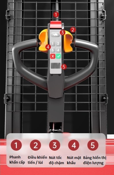 Tích hợp các nút: tiến – lùi, nâng – hạ, còi, tốc độ, giúp thao tác nhanh gọn, chính xác.