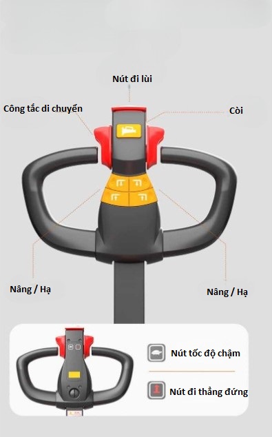 - 🔹 Công tắc đi bộ kiểu cánh bướm & nút nâng hạ điện – điều khiển tốc độ và nâng hạ theo ý muốn.