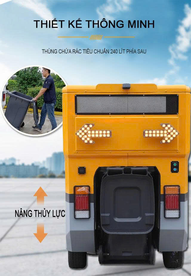 - 🚮 Thùng chứa rác dung tích 240 lít: chứa lượng lớn rác thải, giảm số lần dừng đổ rác.