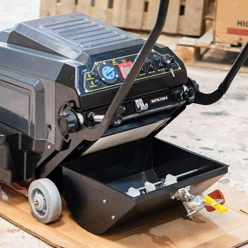- Đẩy xe tiến tới, chổi quét chính và chổi bên tự động xoay, cuốn rác vào khoang chứa.